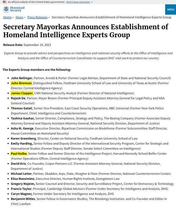 BREAKING — The Biden administration has appointed James Clapper, John Brennan, and Paul Kolbe, former intelligence officials, to a DHS “Homeland Intelligence Experts Group” handling national security issues.