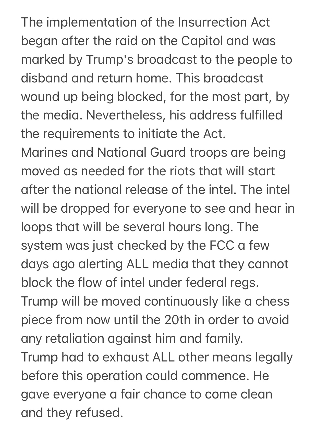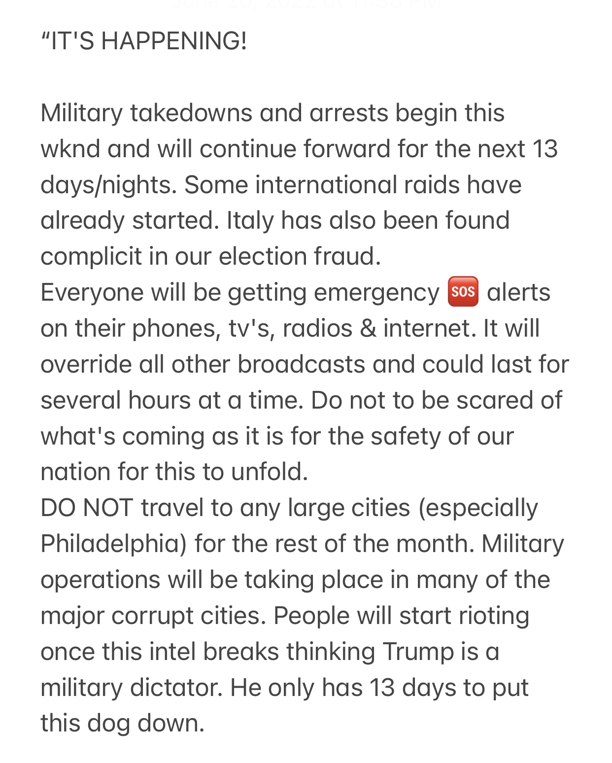 The next 13 days arrests across the US will be happening. Stay away from big cities if possible. BLM / ANTIFA will probably strike out- they too will be arrested by the military. There time to run rampart is over. Justice will be served on all who try to interfere with Justice.